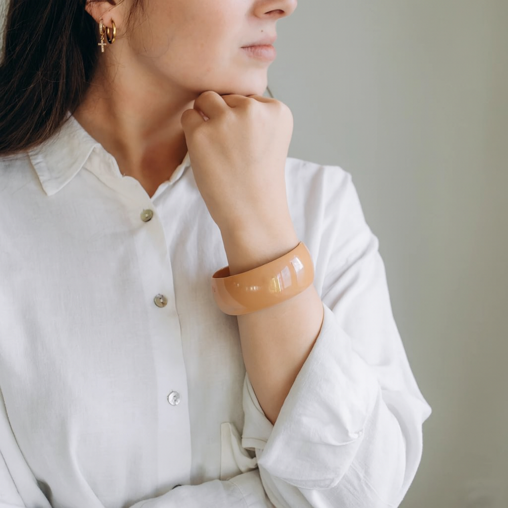 Sa teinte douce et naturelle apporte instantanément caractère et élégance à votre poignet. Avec son design épuré et sa largeur généreuse, ce jonc devient une pièce forte qui valorise votre style au quotidien comme lors d'occasions plus habillées.